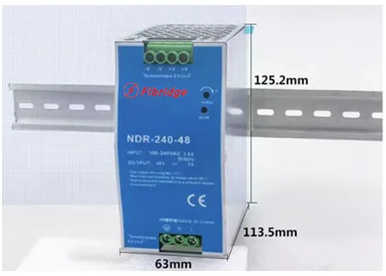 The product is an economical, slim-profile, 240W DIN rail power supply compliant with German industrial standards. It is designed for installation on TS-35/7.5 or TS-35/15 rails, featuring a compact 63mm width to save space in control cabinets.